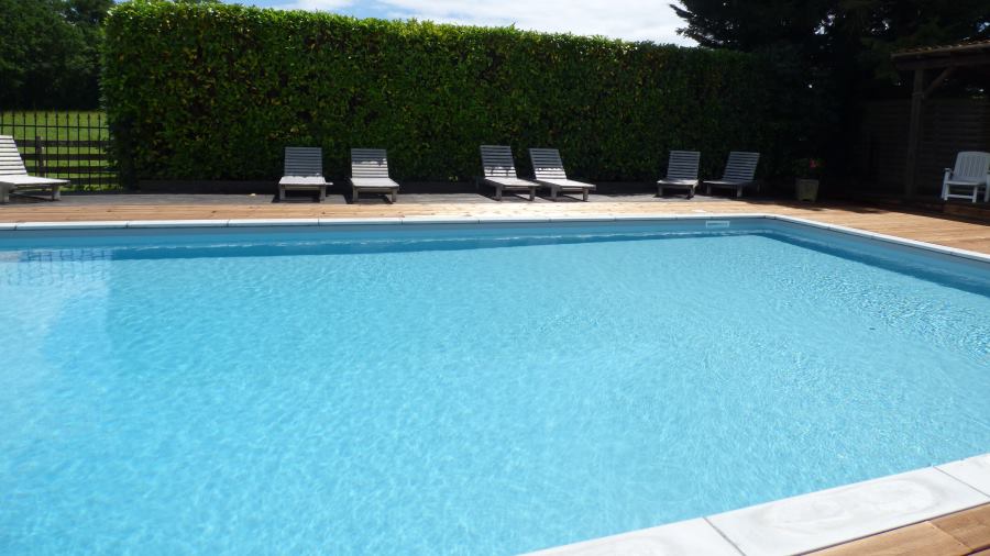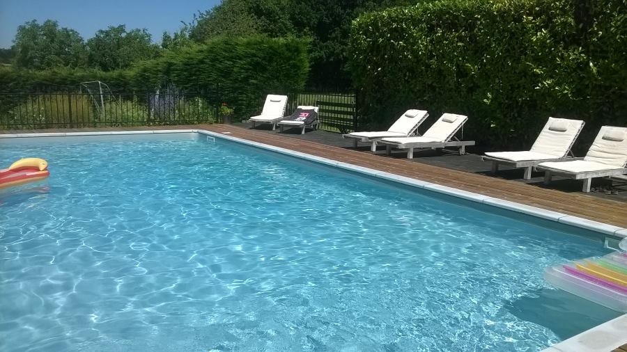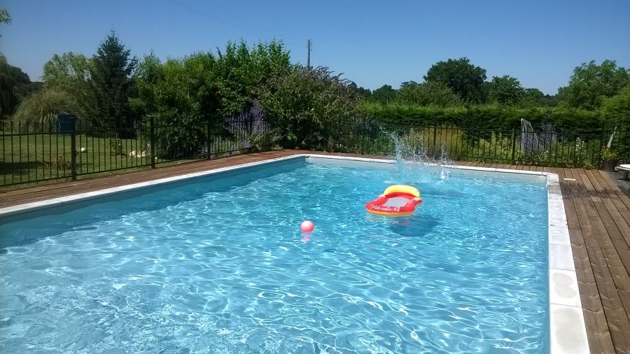 The 12m x 6m swimming pool is fully fenced and offers sun loungers on a raised decking area, table and chairs and an all important hammock.